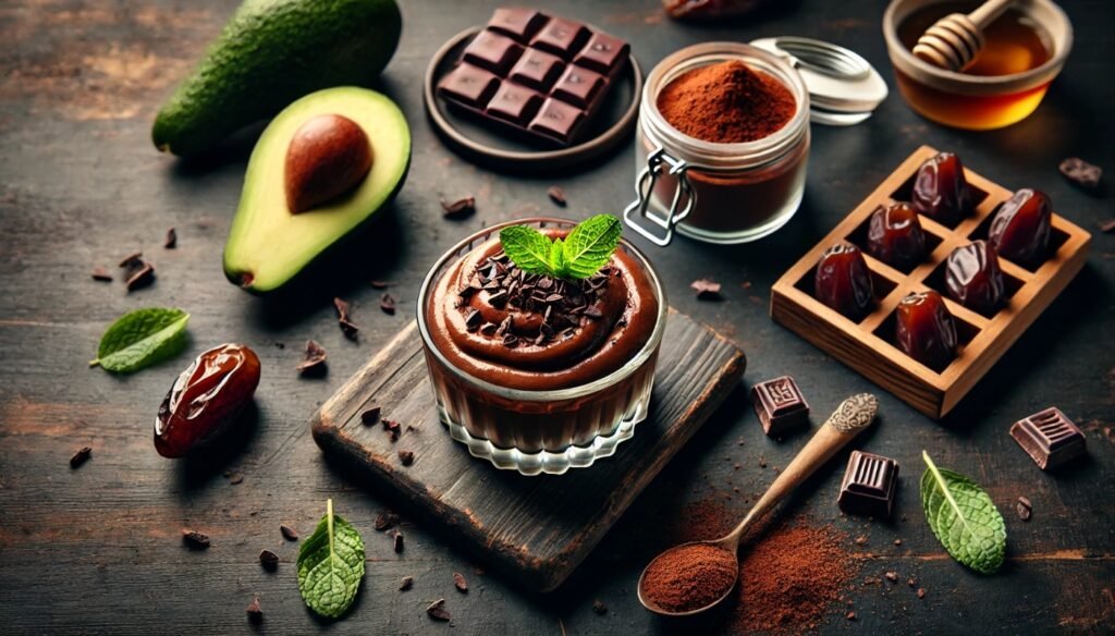 Uma mousse de chocolate crudívora, servida em um copo refinado, acompanhada de ingredientes crus como abacate, cacau em pó e tâmaras. A iluminação quente destaca a textura e a sofisticação da sobremesa.